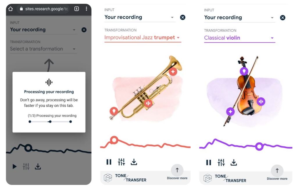 Se trata de Tone Transfer se trata de un algoritmo de aprendizaje automático de Google, es capaz de transformar melodías en señales digitales que después se transforman en melodías con los instrumentos que tu elijas como: