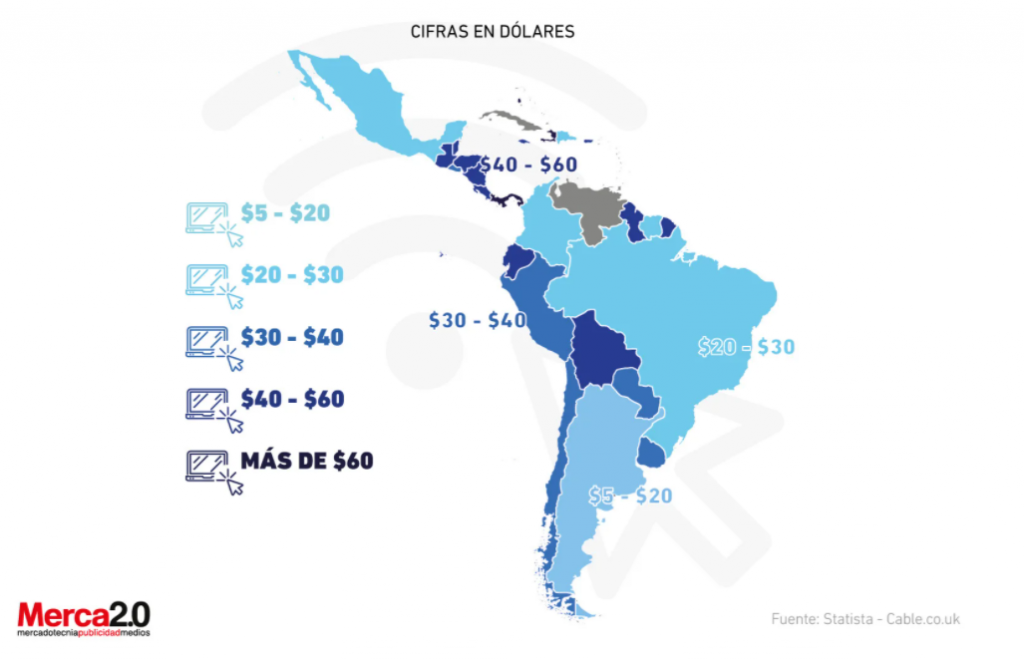 Se generó una gráfica que demuestra una comparación entre los precios de servicio de internet en Latinoamérica, donde se establecen precios en dólares con cifras de entre 5-20, 20-30, 30-40, 40-60 y más de 60. En el gráfico se pudo observar a panamá como uno de los países donde el precio del internet es muy elevado. Por otro lado, hay muchos países donde el costo del internet se encuentra en un precio normal, como lo son Colombia, Brasil y Argentina. Y otros países donde el precio es moderado, como Ecuador, Chile, Nicaragua, Costa Rica, entre otros.