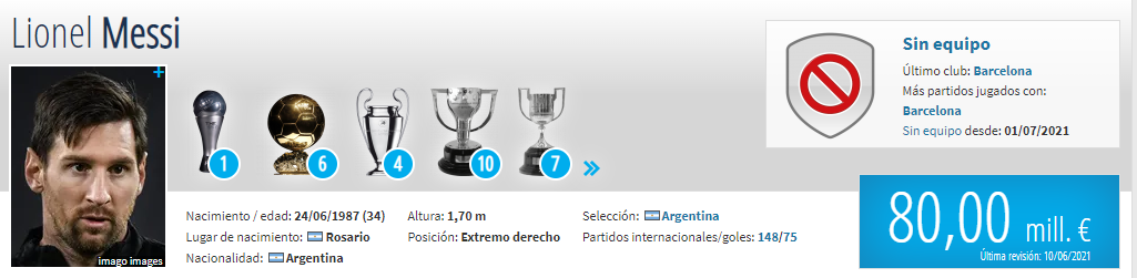 Lionel Messi, no está ni cerca de lo que se posicionó en 2018 según el sitio especializado Transfer Mrkt: en ese año el argentino costaba 180 millones de euros.