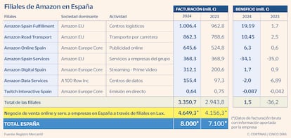 Amazon alcanzó alguna actividad récord en España en 2024. La compañía de tecnología estadounidense logró una facturación bruta de más de 8,000 millones de euros bajo todas las sucursales comerciales en el país, según la información publicada por el gigante comercial electrónico. Esta cantidad resulta de la suma de los ingresos correspondientes de las siete subsidiarias que se basan en el sitio español, y los dos en Luxemburgo y en una sucursal española, Amazon Eu, bajo la venta minorista de la venta minorista de Amazon.esy Amazon Web Services, su negocio y procesamiento de datos de computación en la nube.