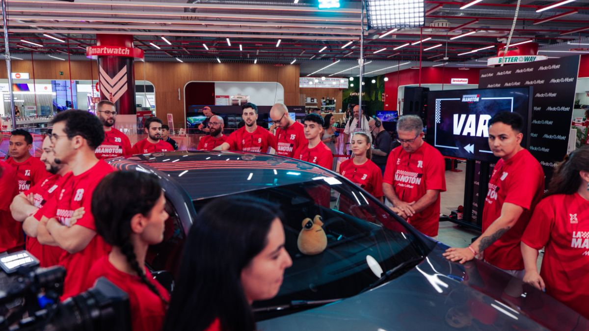 MediaMarkt, la compañía de distribución de electrónica de consumo y servicios, celebra en su tienda de Majadahonda la tercera edición de La Manotón, un evento en el que 20 clientes se enfrentan al desafío de mantener la mano sobre un Mercedes Clase A 250e híbrido, valorado en casi 58.000 euros, durante horas. Quien aguanta más sin levantarla y supera todos los retos, se lleva el coche.