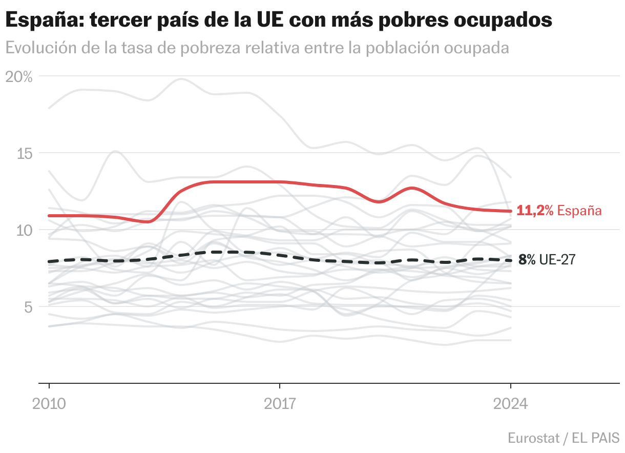Pero quizás el fenómeno más preocupante es el incremento de la pobreza exclusivamente monetaria hasta el 13%. Esto sugiere que, aunque hogares puedan salir de otras categorías de pobreza ―especialmente de la baja intensidad laboral―, continúan percibiendo ingresos por debajo del 60% de la mediana nacional. Y, probándolo, resulta que desde 2008 la tasa de pobreza entre ocupados se mantiene estancada en el 11%, mientras que ha mejorado mucho entre jubilados (del 20% al 13%). Así, España ocupa el tercer lugar en la Unión Europea en términos de pobreza laboral.