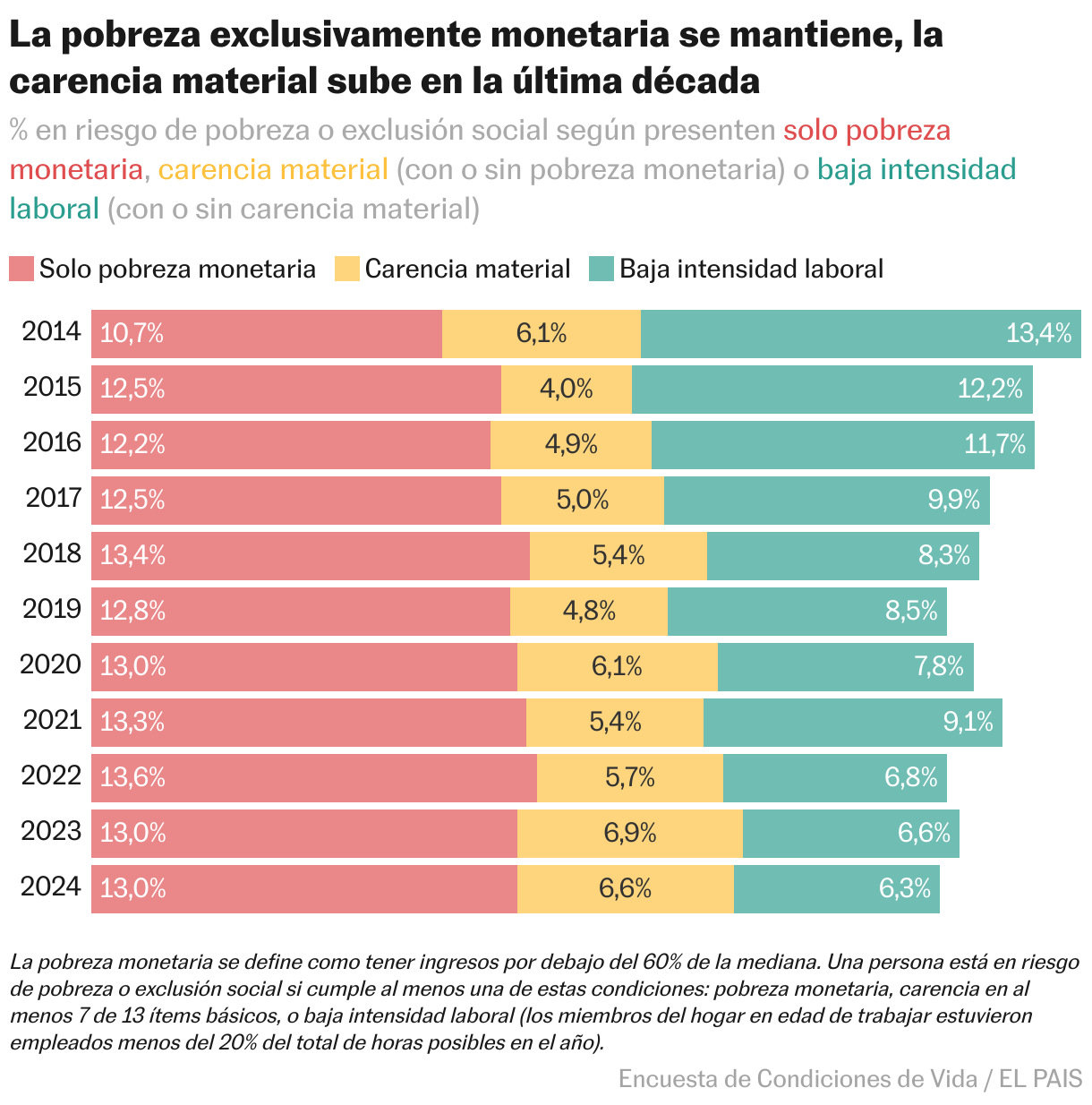 Para comprenderla, lo primero es despiezar el indicador de riesgo de pobreza o exclusión. Una persona se encuentra en esta situación si reside en un hogar que cumple al menos una de estas tres condiciones: pobreza monetaria (ingresos inferiores al 60% de la mediana), carencia material severa (ausencia de al menos 7 de 13 elementos básicos), o baja intensidad laboral (los miembros del hogar en edad de trabajar estuvieron empleados menos del 20% del tiempo posible durante el año).