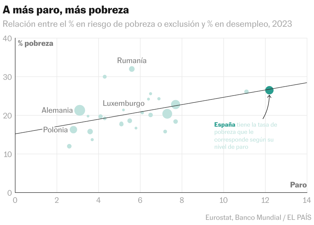 Desembocamos así en que la solución a nuestra alta pobreza relativa trasciende el ámbito de los decretos-ley por el lado de la demanda. Si repetimos el ejercicio de correlación entre riesgo de pobreza y desempleo pero con PIB per cápita, España se sitúa 5 puntos porcentuales por encima de la tasa de pobreza que le correspondería según su PIB per cápita, sugiriendo ineficiencias distributivas en el modelo de crecimiento.