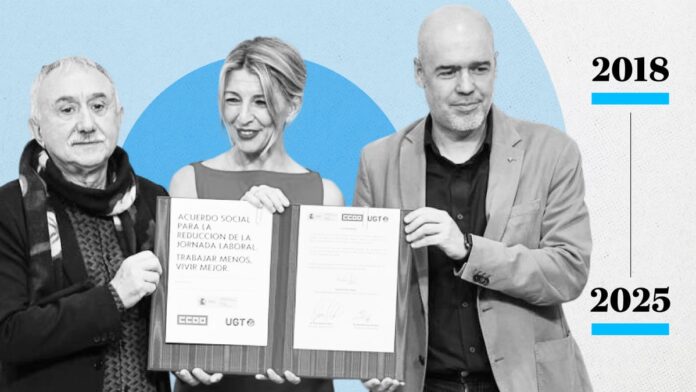 “La reducción de la jornada en España es una medida que se va a estudiar en las universidades de todo el mundo”, dijo Díaz en el acto formal de firma del acuerdo con UGT y CC OO. El anteproyecto alzaba el vuelo en dirección al Consejo de Ministros.