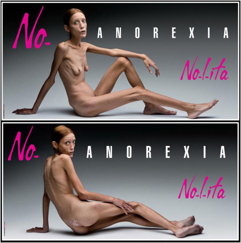 En el 2007, Italia presenció una fuerte campaña en contra de la anorexia promovida por la marca de moda Nolita y hechas por el fotógrafo Oliviero Toscani, ya reconocido por sus polémicas campañas en contra de la marca Benetton. En las imágenes se muestra a una mujer completamente desnuda que sufre esta enfermedad, con las palabras «No-Anorexia».
