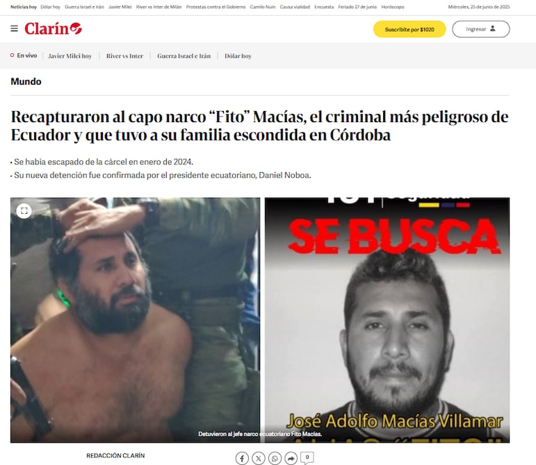 En el portal digital del medio argentino El Clarín replicaron la noticia de la captura de Fito con el titular: “Recapturaron al capo narco “Fito” Macías, el criminal más peligroso de Ecuador y que tuvo a su familia escondida en Córdoba»