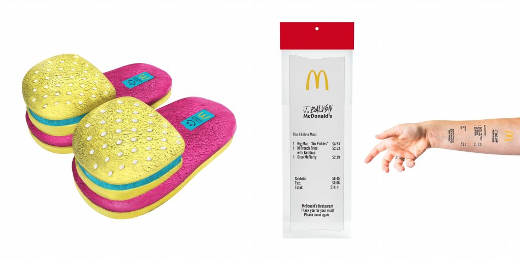 Entre su catálogo de mercadería tiene desde abrigos, anillos hasta un tatuaje muy particular. El tatuaje que salió a la venta, producto de la colaboración entre McDonald’s y J Balvin, muestra un recibo de compra. Lo que está escrito en el recibo es la firma de J Balvin y el nombre de la marca McDonald’s, seguido de eso en la especificación de la compra, se detalló algo que el cantante comería si fuera al lugar de comida rápida. Sin duda McDonald’s sorprendió a todos con estas colaboraciones y con su catálogo de mercadería que incluye un tatuaje temporal de un recibo de compra.