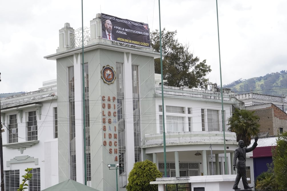 El edificio del Colegio de Abogados, ubicado en el centro norte de Quito, luce un cartelón con la fotografía de Godoy y un mensaje en el que le exigen que renuncie.