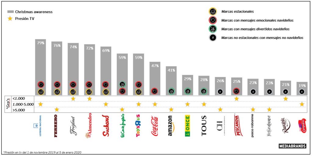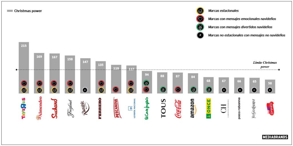Según el estudio realizado por IPG Mediabrands, se pudo conocer que las marcas situacionales son muy requeridas por los clientes, gracias a su gran potencial navideño. El gráfico muestra que la marca ToysRus, va a la cabeza, seguido por más marcas que también deben su fama a las fiestas navideñas.