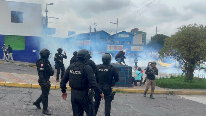 A la altura del redondel de la Villaflora, en el sur de la ciudad de Quito, a cientos de manifestantes de varias organizaciones sociales les fue impedido el paso por parte de miembros de la Policía Nacional con bombas lacrimógenas. Esto mientras se alistaban para marchar en contra de las medidas económicas adoptadas por el Gobierno del presidente Daniel Noboa y, además, por el cumplimiento de 533 años de la llegada de europeos a territorios de América.