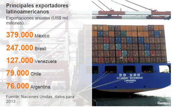 Según datos del gobierno mexicano, las exportaciones totalizaron $397.000 millones en 2014, un 4,6% más que el año anterior y superior a las de cualquier otra nación de la región.
