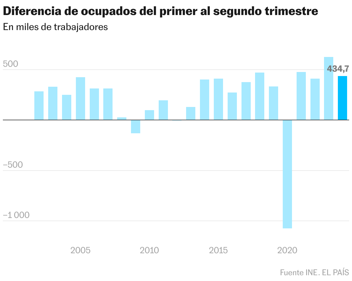 La hipótesis del Gobierno es que el límite a la temporalidad que introdujo la reforma laboral, que ha hundido la proporción de empleados temporales (del entorno del 26% al 15%), hace que muchas empresas adelanten sus contrataciones, lo que resta poderío a la creación de empleo en el séptimo mes, pese a la fuerza del turismo en esas fechas. Además, muchas empresas no turísticas prescinden de sus trabajadores en julio y en agosto por el bajón de la actividad asociado a las vacaciones, con la educación como el mejor ejemplo del fenómeno: de mayo a junio se perdieron 56.592 empleos en este sector.