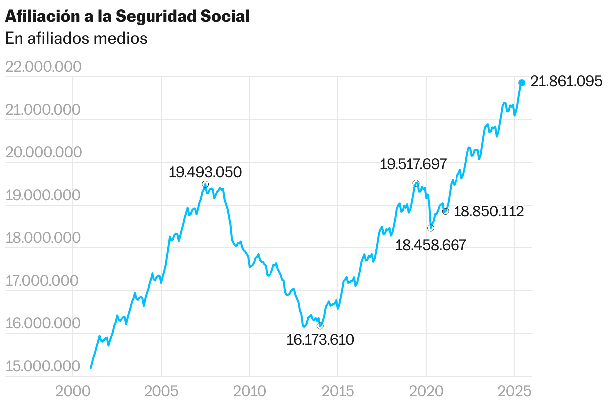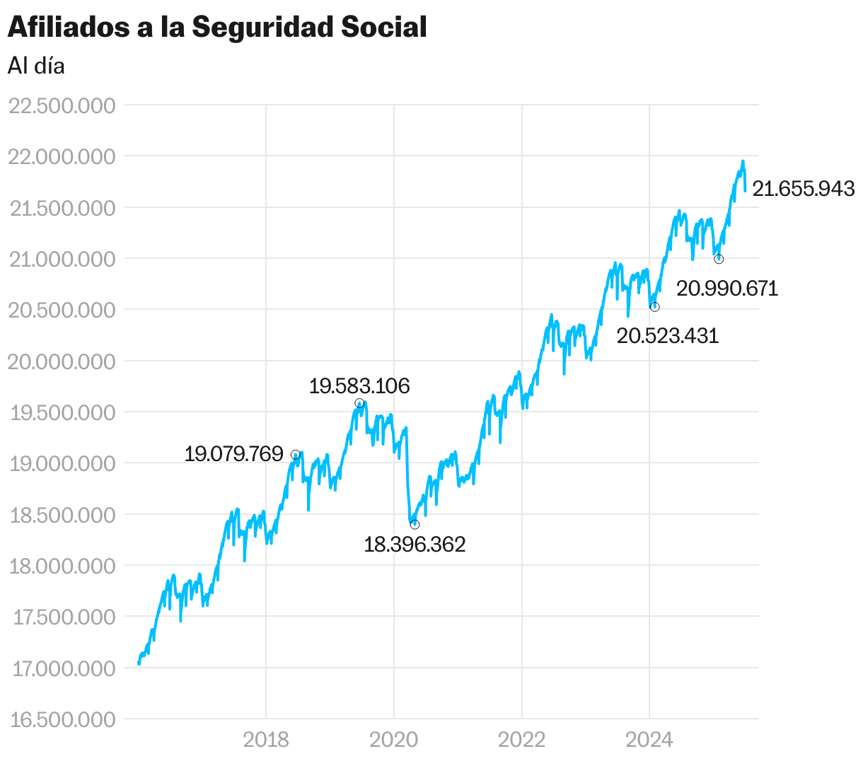 Si tampoco se llega a los 22 millones de afiliados entonces, y salvo que algún acontecimiento haga descarrilar antes la economía, lo más previsible es que el hito sí se consiga en la Semana Santa de 2026. Esta empezará a finales de marzo y termina en abril. Con esos días festivos empieza el periodo virtuoso para el mercado laboral, con un aumento exponencial de las contrataciones que se extiende hasta el periodo estival.