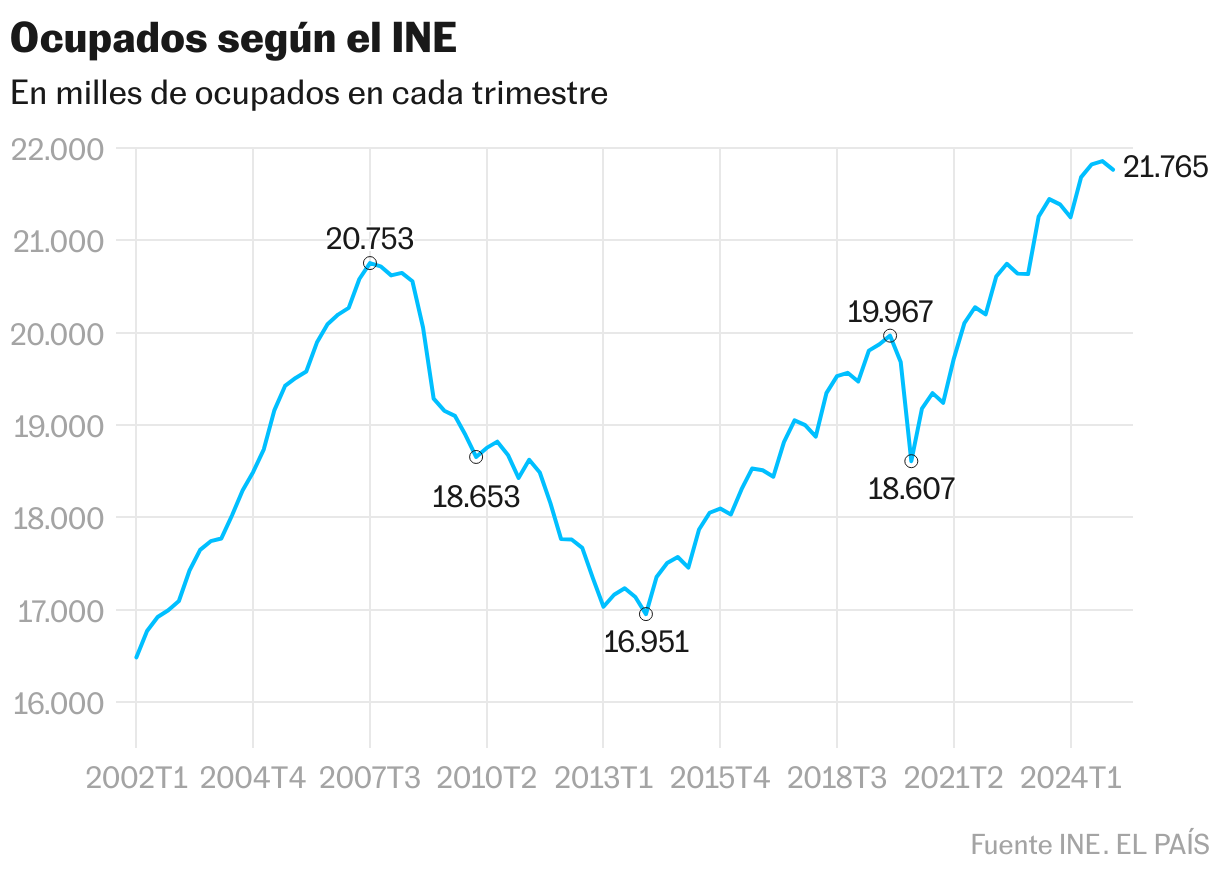 El primer trimestre de 2025 terminó con 21.765.400 de ocupados, a 235.000 ocupados de los 22 millones. Atendiendo a la generación de empleo de los últimos años en el segundo trimestre, todo apunta a que España superará esa cifra con holgura: en 2024 se crearon 434.700 empleos, en 2023 624.200 y en 2019, antes de los años afectados por la pandemia, 333.800. Con cualquiera de esos registros España superaría la barrera de los 22 millones de ocupados en la EPA.