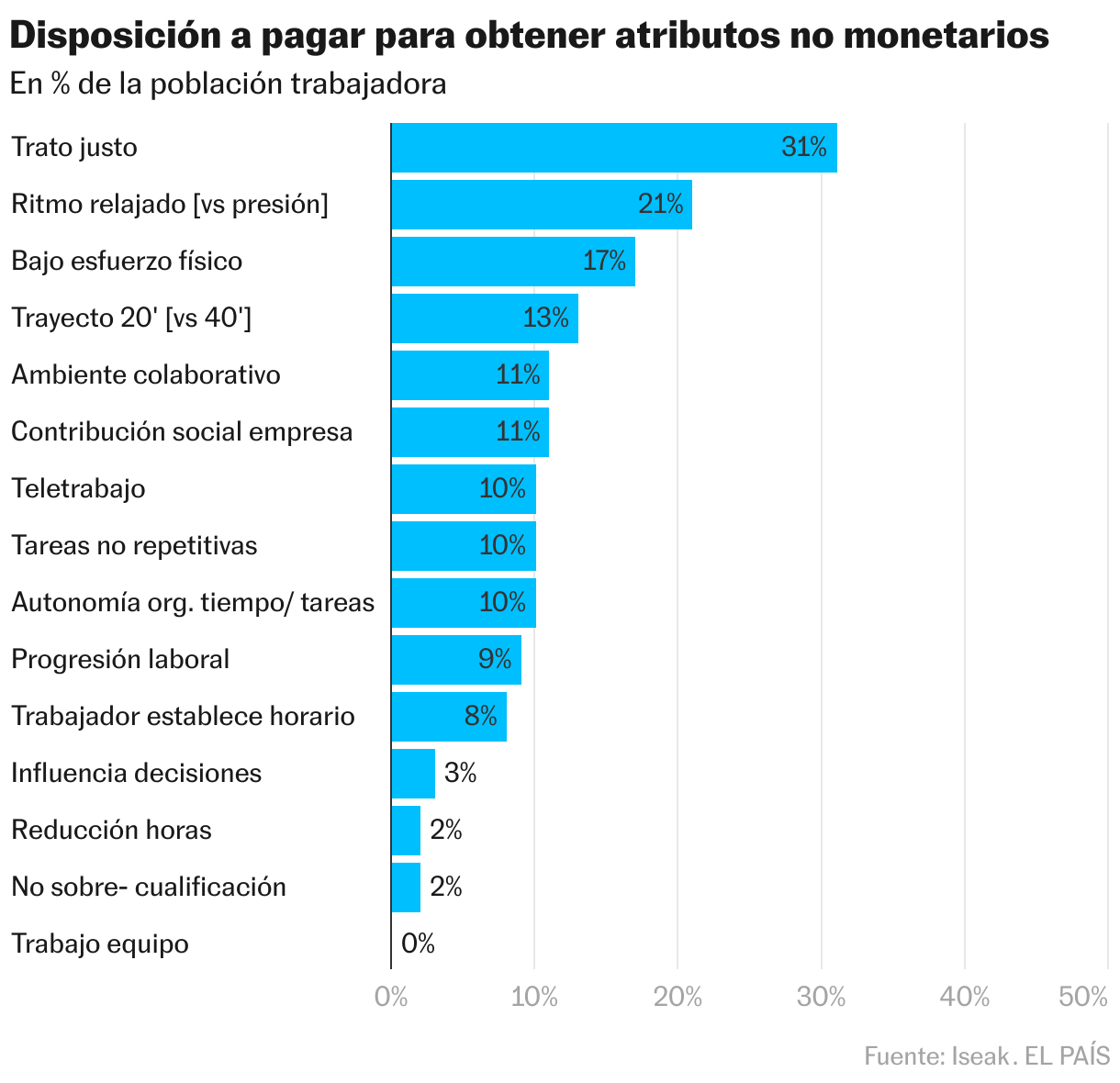 Los analistas de ISEAK han tratado de cuantificar en qué medida los valores de la población son los diferentes atributos del trabajo. Para hacer esto, han desarrollado pruebas discretas en las que los encuestados tuvieron que elegir entre dos ofertas de trabajo que difieran en el salario y otros atributos específicos. «De las decisiones de las personas entrevistadas, el porcentaje del salario que estaría dispuesto a sacrificar cada uno de estos atributos a cambio de obtener cada uno de estos atributos», explican los investigadores.