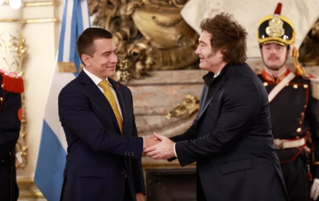 El presidente de Ecuador, Daniel Noboa Azin, se reunió este jueves con su homólogo argentino, Javier Milei, en la Casa Rosada de Buenos Aires, donde ambos mandatarios coincidieron en la necesidad de reforzar la cooperación bilateral en seguridad, comercio, educación, cultura y otros sectores.