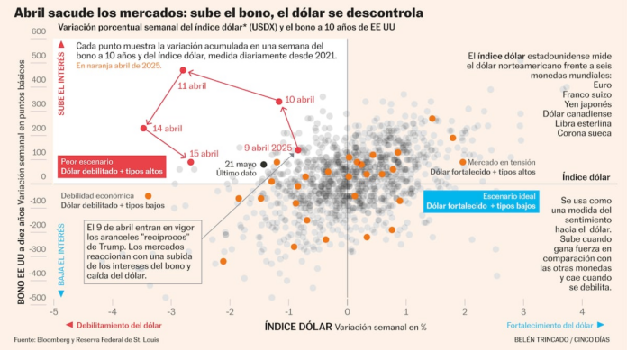 Y es que estos episodios, incluso lejos de las economías menos complejas e incluso las instituciones más débiles, generalmente se asocian con el escape de capital. En una economía globalizada, el aumento en las dudas sobre la sostenibilidad fiscal y monetaria de un país implica que las ventas activas de este país y los ingresos de dichas ventas generalmente se cambian a otras monedas para diversificar riesgos o devolver inversiones. En activos como acciones, esto implica el caso de los índices del mercado de valores. Para las deudas, reduce el precio de lo que aumenta su rentabilidad. Y para la moneda se observa que se observa una depreciación. Se puede verificar en la tabla que se acompaña de que las combinaciones de la rentabilidad de las deudas con la depreciación del tipo de cambio han pasado unos días en la historia reciente del dólar, pero no en la intensidad que se observó en los días más entusiasmados de la segunda gestión de Trump.