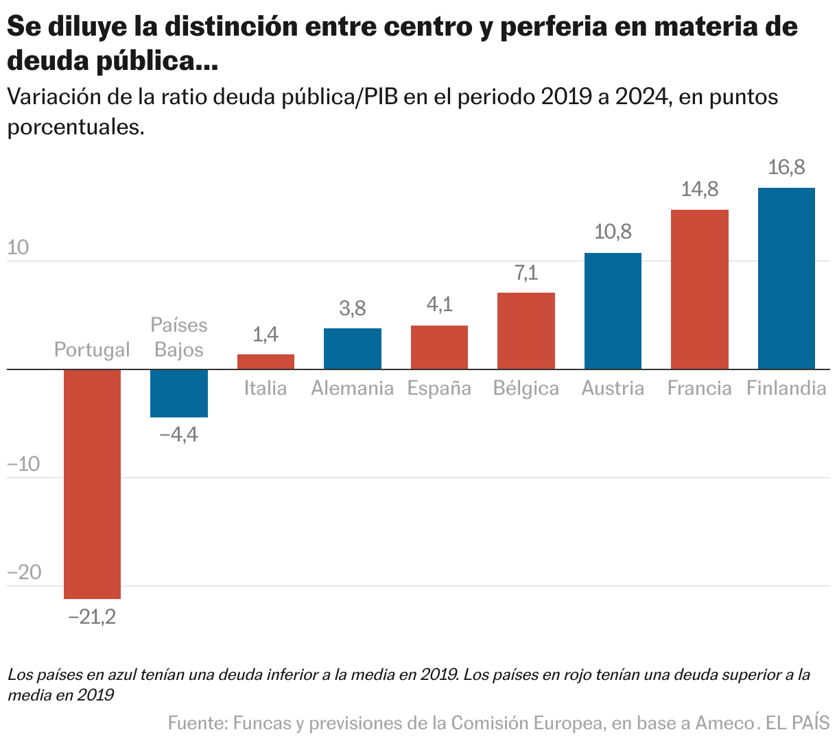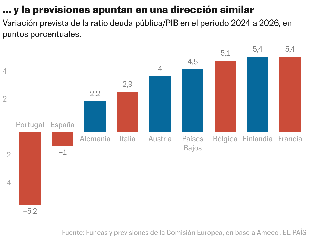 Los países «económicos» se dan cuenta de los riesgos de estancamiento y, según otro de los rígidos del marco fiscal anterior. Según los pronósticos de la Comisión Europea, Alemania, Austria, Finlandia y los Países Bajos aumentarán su índice de deuda entre 2 y 5 puntos porcentuales, más del doble que el promedio de la zona euro. Y más que Italia, que logra una cierta estabilización o España, Grecia y Portugal con vías aéreas descendentes (muy ligeramente en nuestro caso).