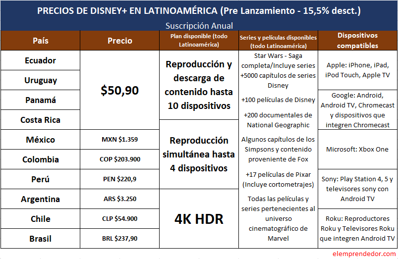 A continuación una lista con los precios e información sobre la suscripción de Disney+ para Latinoamérica. En el caso de Ecuador, cabe recalcar que el precio no incluye el impuesto a los servicios digitales, por lo que se le agregará un valor más al precio final.