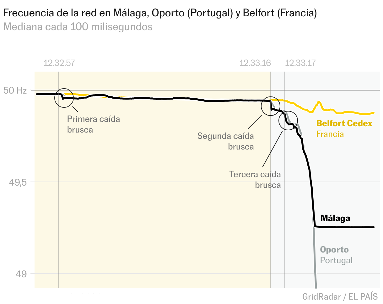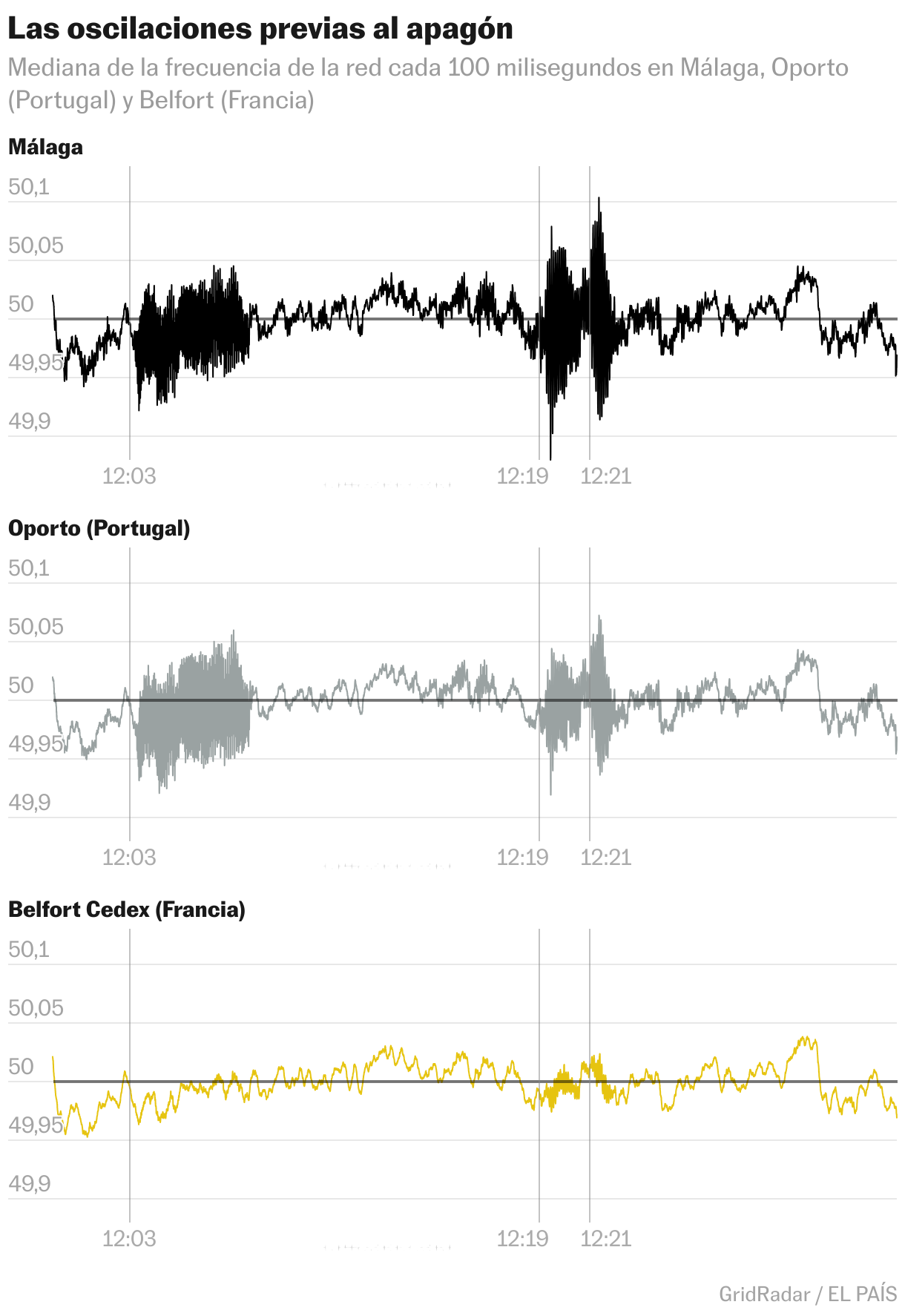 La comisión creada por el gobierno examina si estas dos primeras oscilaciones con las conexiones, que ocurrieron después de 12 horas, 32 minutos y 57 segundos. Esta es la secuencia, según la información que se ofrecieron Red Electrica y el Ministerio de Transición Ecológica: