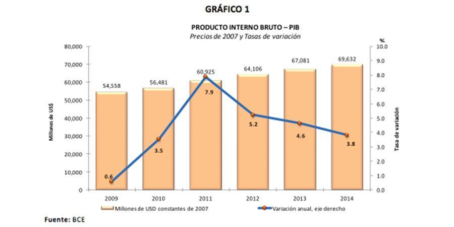 Según el BCE, la tasa de variación anual del Producto interno Bruto (PIB) en el 2014 estuvo determinada principalmente por la contribución al crecimiento del Gasto de Consumo Final de los Hogares (2.41 puntos porcentuales), seguido por las Exportaciones (1.66 puntos) e Inversión (1.02 puntos).