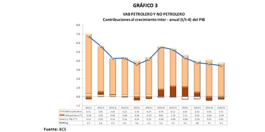 El resultado del crecimiento del PIB de 3.5%, entre el cuarto trimestre del 2013 y el cuarto trimestre del 2014, se explica en gran medida por el desempeño de la economía no petrolera (construcción, manufactura y comercio), que creció en 4.3% y contribuyó con 3.71 puntos porcentuales al crecimiento total interanual.