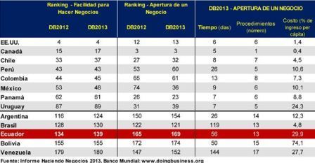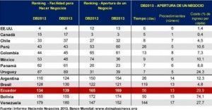 Pero Ecuador no entra en las estadísticas de aumento, ya que la investigación detalla que para un emprendedor ecuatoriano abrir un negocio en su país le toma 56 días, realizando 13 pasos, además de costarle el 29,9% del ingreso per cápita de la nación. Esto ubica a Ecuador en el puesto 139 de las 185 economías analizadas en el ranking general de facilidad para hacer negocios.