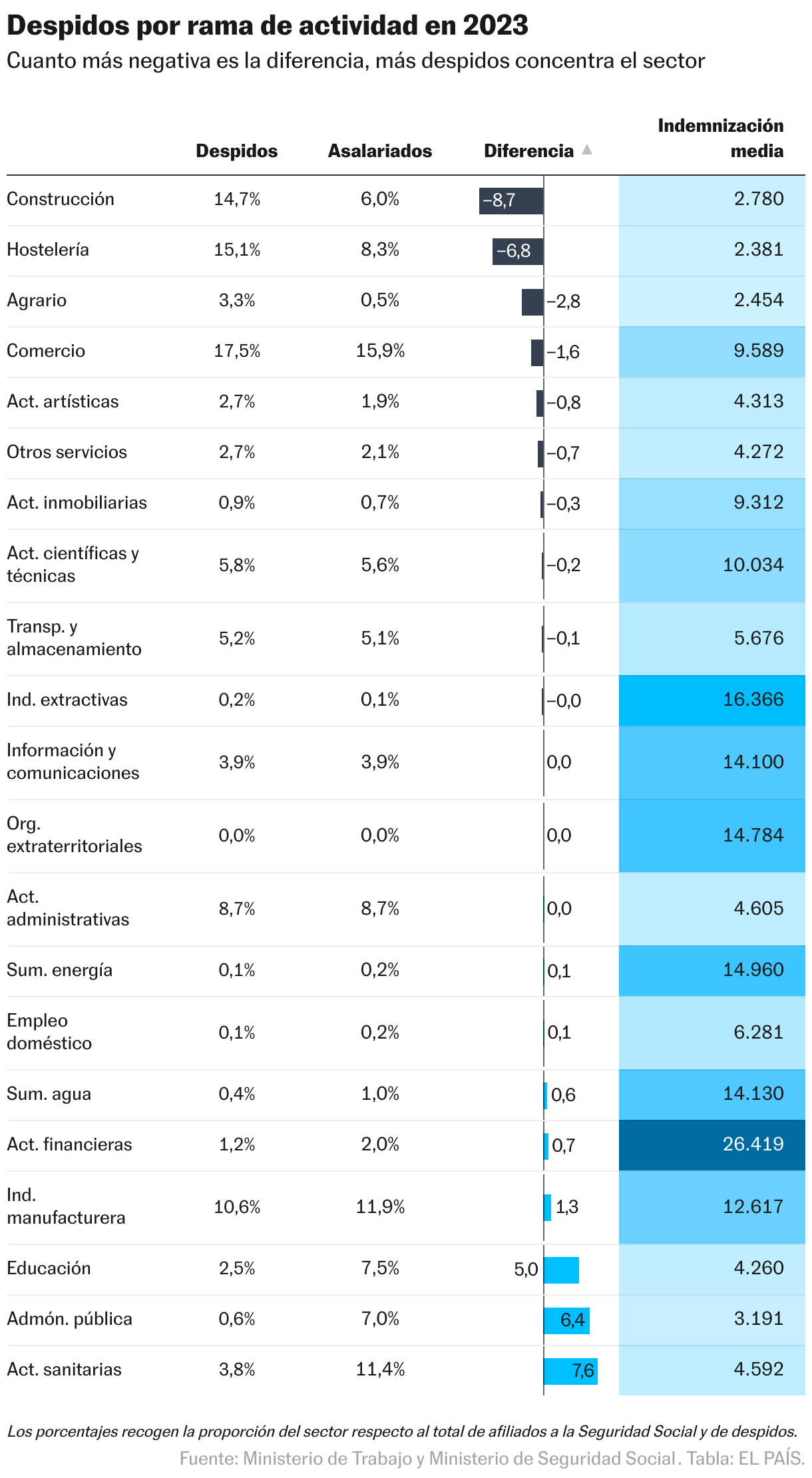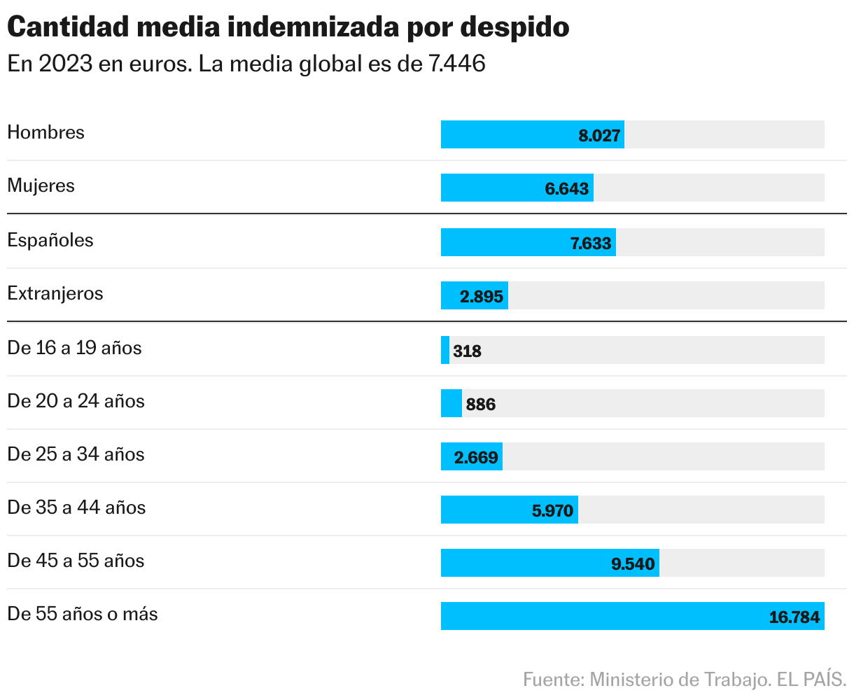 La indemnización media en España en 2023 (último dato disponible) fue de 7.446 euros, con diferencias muy reseñables por edades: entre los despedidos de 20 a 24 (que normalmente llevan menos tiempo en sus empresas) fue de 886 euros, frente a los 16.784 de los mayores de 55. Y sea mucho o poco, en función de la antigüedad, es una cifra que la empresa puede anticipar, lo que la doctrina del CEDS sanciona en caso de despidos injustos.
