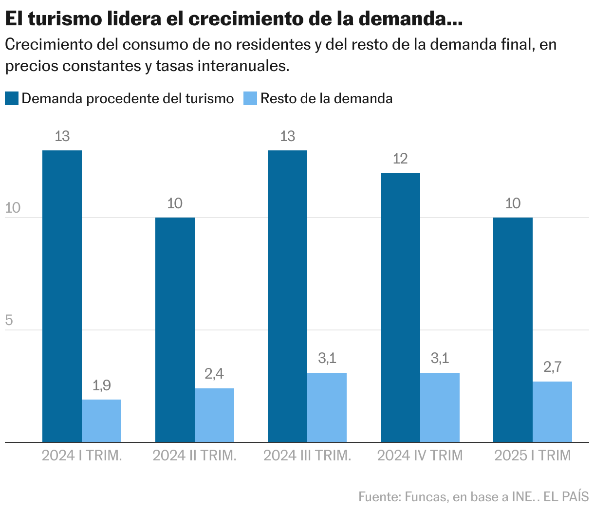 Después de un triple crecimiento explosivo, se esperaba una moderación de la entrada de turistas extranjeros Eso no sucede en este momento. En el primer trimestre del año, los gastos reales para el consumo no residente (un enfoque para la contribución del turismo a la economía española) aumentaron en un interior. Esta es la parte de la demanda más animada. Hasta el momento de la amenaza de obstaculizar el cambio en el modelo productivo, este objeto del deseo de la política económica española.