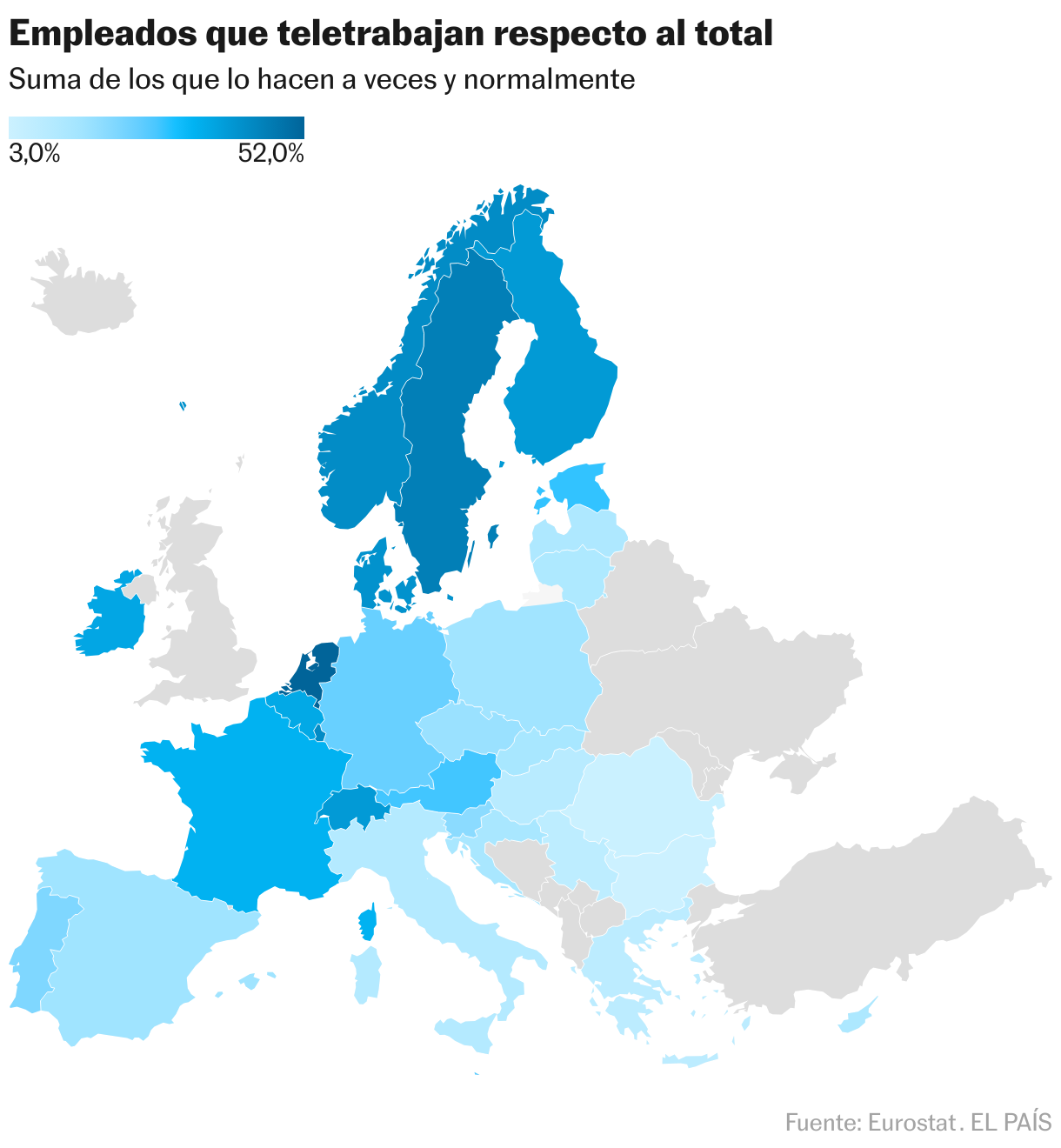 El promedio europeo de teletrabajadores ha seguido una tendencia parecida a la española, pero siempre con mucha ventaja: el último dato que detalla Eurostat es del 22,6% de media para los Veintisiete. Los países europeos con una mayor porción de teletrabajadores son Países Bajos (52%), Suecia (45,6%) y Luxemburgo (42,8%). En la posición contraria se encuentran Grecia (7,8%), Rumania (3,5%) y Bulgaria (3%). El patrón salta a la vista: los países con economías más avanzadas, más tecnológicas y de mayor valor añadido, teletrabajan más que los que se caracterizan por justo lo contrario. Esta dinámica se repite en la desagregación por comunidades autónomas. En la Comunidad de Madrid se teletrabaja en 2024 más del triple que en Canarias.