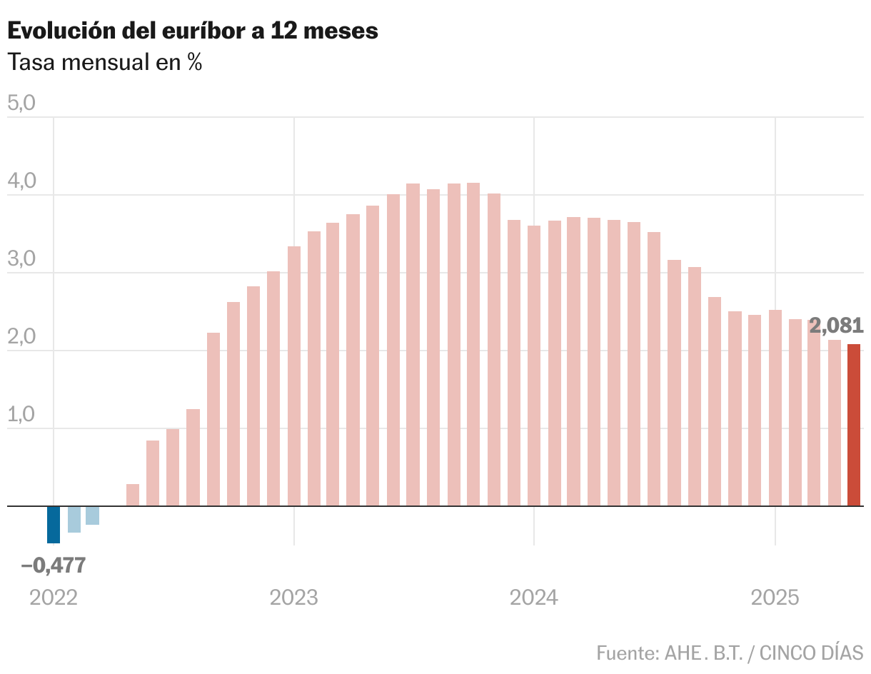El cambio frente a abril, cuando estaba en el 2,143%, ha sido muy leve, pero en el cálculo de las hipotecas se dejará sentir, porque lo relevante es la comparación con lo que pasaba un año antes, y en mayo de 2024 estaba mucho más arriba, en el 3,680%. La caída interanual, de hecho, es la mayor desde diciembre de 2009, hace más de 15 años. Para una hipoteca media, el abaratamiento será de unos 137 euros al mes, o 1.644 euros al año. Los cálculos se realizan sobre la hipótesis una hipoteca media: 145.673 euros a pagar en 25 años, según los datos del INE para 2024.