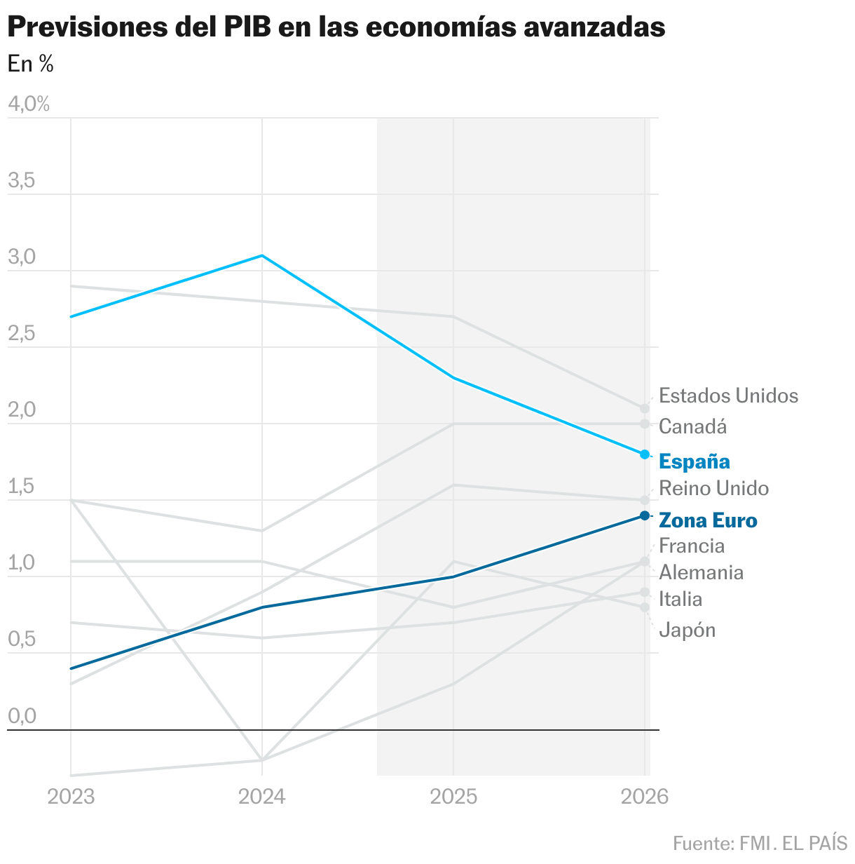 El Brecha económica entre Estados Unidos y Europa. se expande. En vísperas de la llegada de Donald Trump a la Casa Blanca con su amenazas de aranceles y promesas de recortes de impuestos, El Fondo Monetario Internacional (FMI) considera que el país será el de más rápido crecimiento entre las economías avanzadas del mundo en 2027, con un producto interior bruto (PIB) que aumentará un 2,7%, tras haber elevado su previsión en 0,5 puntos. Al mismo tiempo, en la actualización de enero de su informe perspectiva económica mundial, rebaja en dos décimas las previsiones para la eurozona, hasta el 1%, con recortes para Alemania, Francia e Italia. España es la excepción europea El fondo eleva en 0,2 puntos su previsión de crecimiento para este año, hasta el 2,3%, pero mantiene su previsión del 1,8% para 2026.