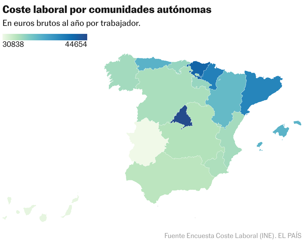 Por territorios, la comunidad de Madrid era nuevamente el lugar donde los costos laborales eran más altos en todo el país (44,653.53 europeos), por delante del país vasco (42,732.63) y Navarra (40,676, 53). En Extremadura (30,838.2), Islas Canarias (31,233.98) y Andaluce (32,912.39), se marcaron los gastos más contenidos. A pesar de esta clasificación, el Extremadoura fue la desventaja de Los Ángeles, un aumento en los costos más altos en comparación con 2023 (7.4%), antes de la ubicación de marchito (5.3%) y asturias (4.48%).