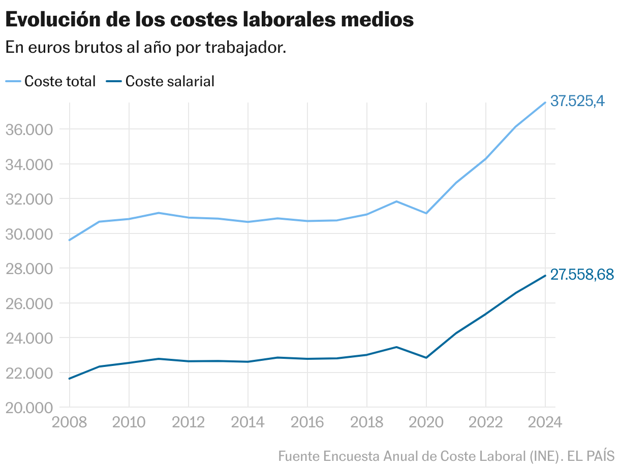 El costo de la mano en un trabajador fue de 37,525.40 europeos en 2024 (37,308.93 líquidos), 3.9% más que el año anterior. De estos gastos generales, 27,558.68 europeos correspondieron al grave salario anual de trabajadores, 3.8% más que en 2023, según datos publicados el martes por el Instituto Nacional de Estadísticas (INE). Este aumento en la remuneración está por encima del 3% acordado por empresarios y sindicatos para este ejercicio En el contrato de empleo y negociación colectiva (AENC). El resto de los costos (contribuciones, compensación, capacitación …) crecieron un 4,4% en comparación con el año anterior, hasta llegar a 9,750.25 europeos.
