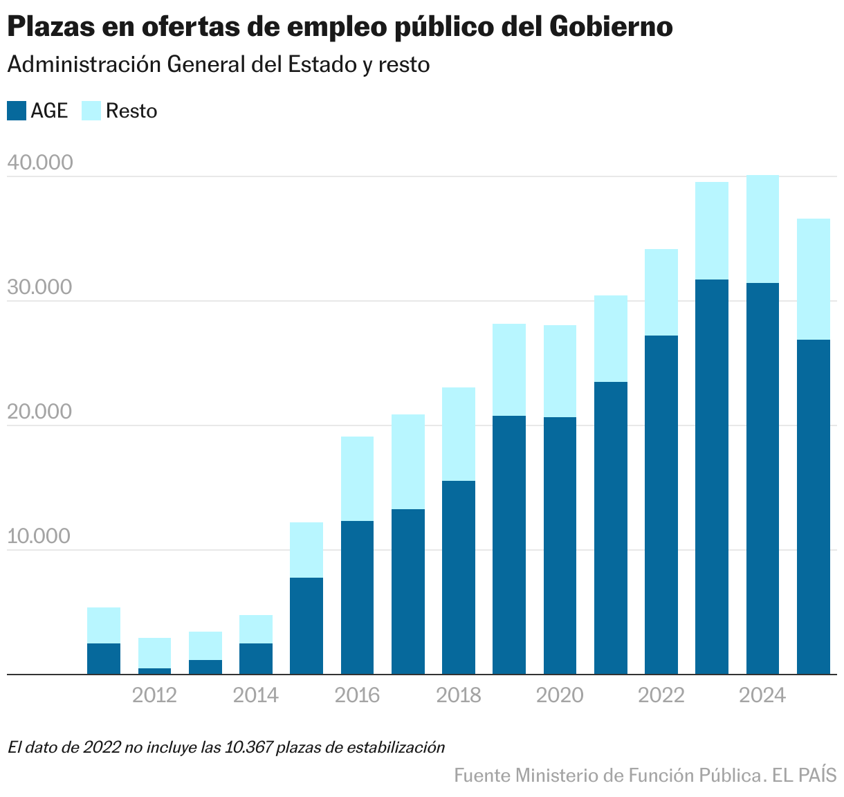 “En los últimos años, la edad media del empleado público ha bajado en dos años, pasando de los 51 a los 49 años actuales gracias a las incorporaciones récord: en 2024 las altas duplicaron a las bajas, con un crecimiento neto de 9.000 efectivos”, destaca el Ministerio de Función Pública, que también subraya la “agilización” de los procesos selectivos: “El 93% de los procesos de la OEP de 2024 se han publicado en 2024 y la gran mayoría de los procesos realizan la fase de oposición en menos de un año”. Pese a estos datos, los sindicatos siguen denunciando que falta rapidez en esos procesos.