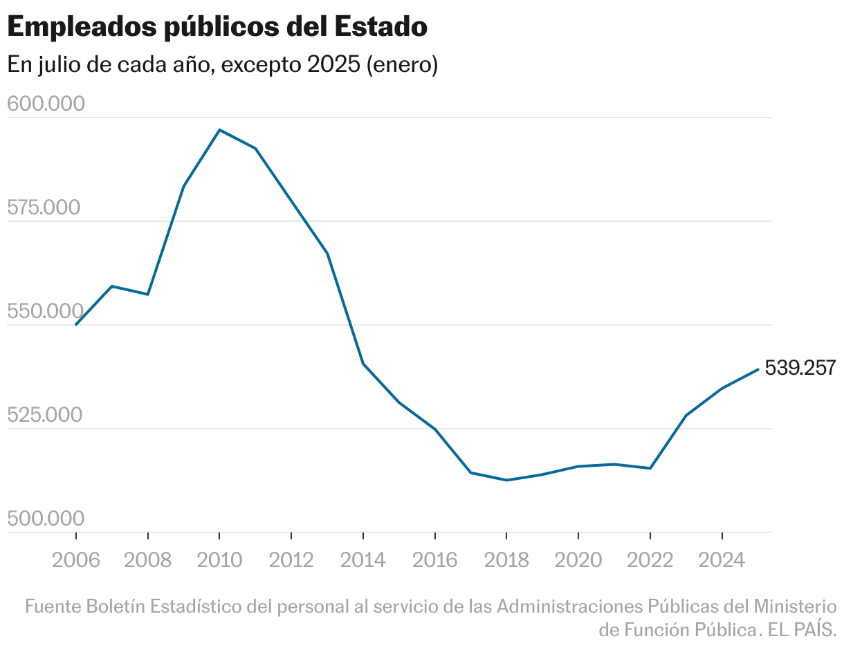 Según los últimos datos del Boletín Estadístico del Personal al Servicio de las Administraciones Públicas, a enero de 2025 hay 539.257 trabajadores en el sector público del Estado, el que se nutre de estas ofertas de empleo. Son 10.000 más que en el mismo mes del año pasado, pero la cifra aún está muy lejos de las que se registraban antes de la explosión de la burbuja del ladrillo, cuando la cifra rondaba los 600.000 efectivos. Pese a las ofertas récord de empleo público de los últimos años, España no alcanza esas cifras porque el flujo de jubilaciones es muy intenso.