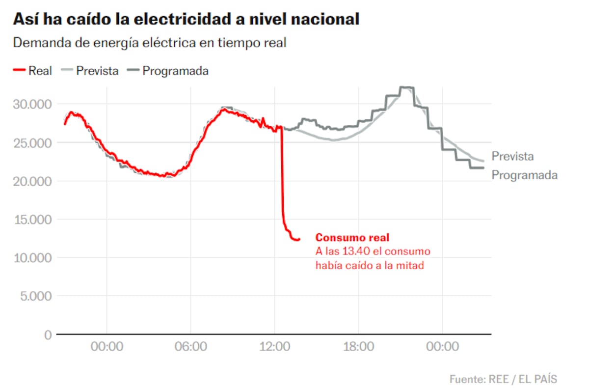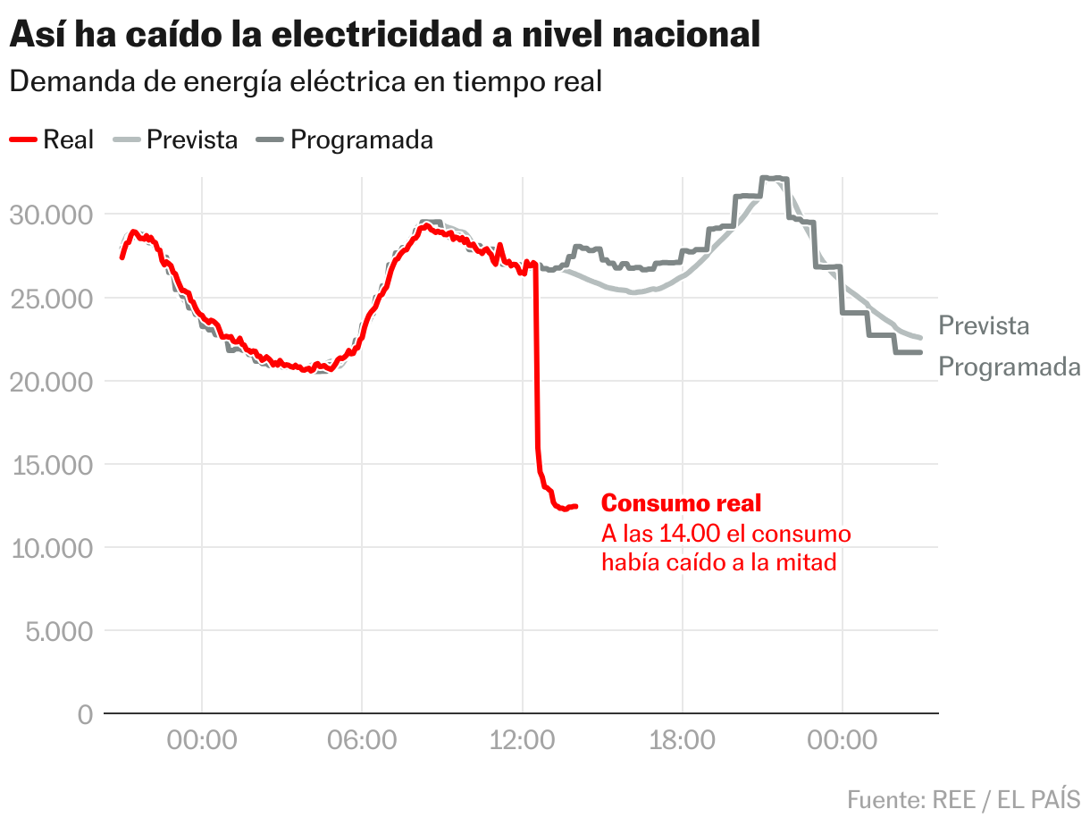 La demanda real de electricidad en España se redujo drásticamente con el almuerzo. A las 12.55 Una gran falla de energía Lo había reducido hasta que se quedó al 50%.