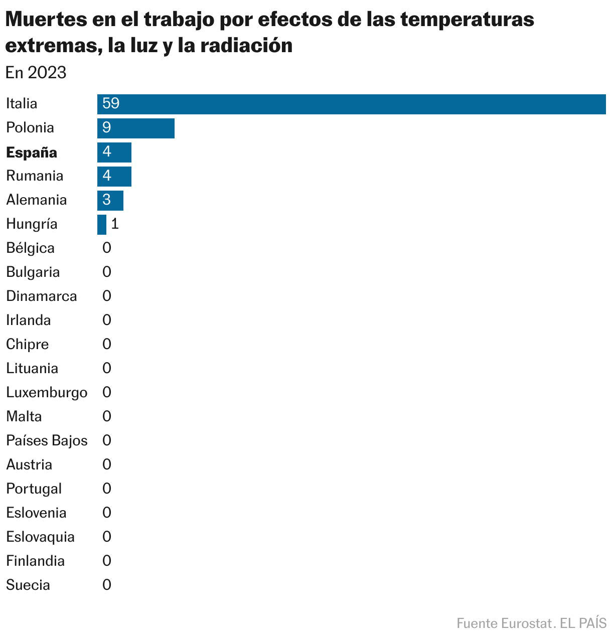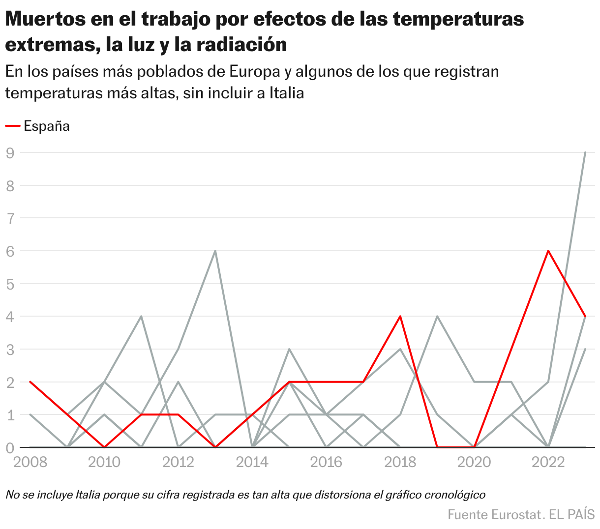 Un vistazo a las estadísticas de accidentes de trabajo de Eurostat muestra que el problema se da más allá de los Pirineos. De los 27 países de la Unión Europea, la oficina estadística recoge cifras de 2023 (las últimas disponibles) sobre muertes relacionadas con temperaturas extremas, luz y radiación de 21 Estados. La mayoría no notifica ni un deceso por estos motivos, en algunos casos pese a lo alto que llega el mercurio: es el caso de Grecia, con ninguna muerte notificada por calor desde 2008. Francia, el segundo país más poblado de la Unión Europea, solo notifica un deceso laboral desde entonces.