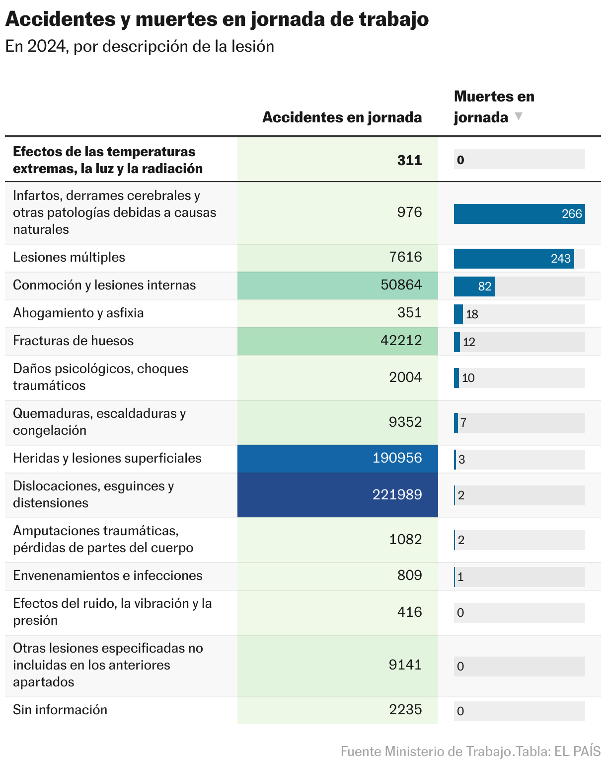 Los últimos datos veraniegos disponibles, del año pasado, desagregan los accidentes de trabajo en función de distintas variables. Una de ellas es la descripción de la lesión: hubo 111 accidentes por calor e insolación, todos ellos leves. Hay otros 113 accidentes relacionados con sucesos por altas temperaturas, pero se trata de una categoría indefinida que también agrupa lesiones por radiación no térmica o por frío. De esos 113, solo uno de los registrados es grave. En total hubo 311 accidentes por efectos de las temperaturas extremas (tanto altas como bajas), la luz y la radiación.