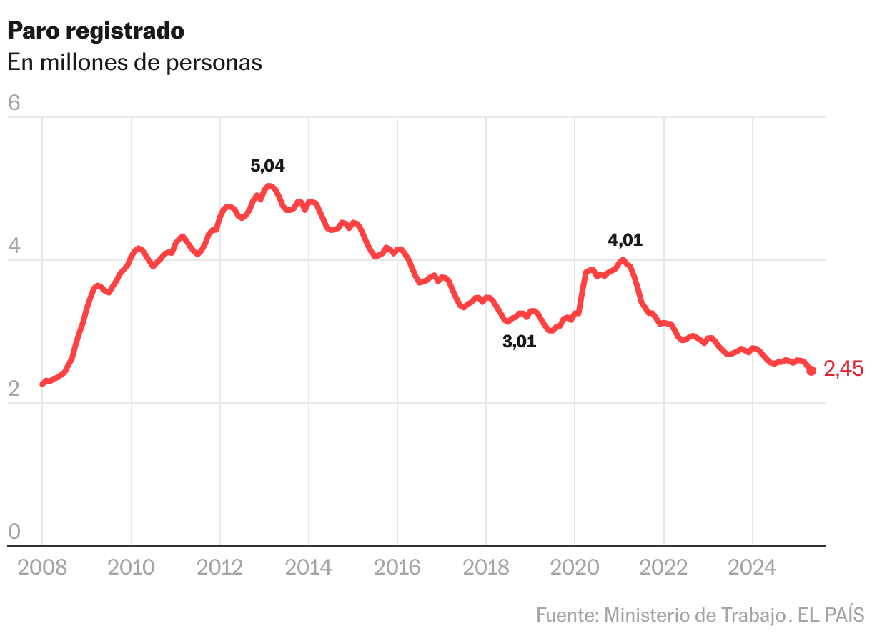 Las estadísticas del mercado de trabajo que el Gobierno hace públicas todos los meses traen en esta ocasión un dato simbólico: el número de personas en desempleo registradas en las oficinas del Servicio Público de Empleo Estatal (SEPE) ha bajado de la barrera de los 2,5 millones de parados por primera vez desde julio de 2008, hace 17 años. Los datos publicados este martes por el Ministerio de Trabajo indican que el número de desempleados inscritos se ha reducido en 57.835 personas en mayo respecto al mes anterior, con lo que el número total de parados se sitúa en 2.454.883.