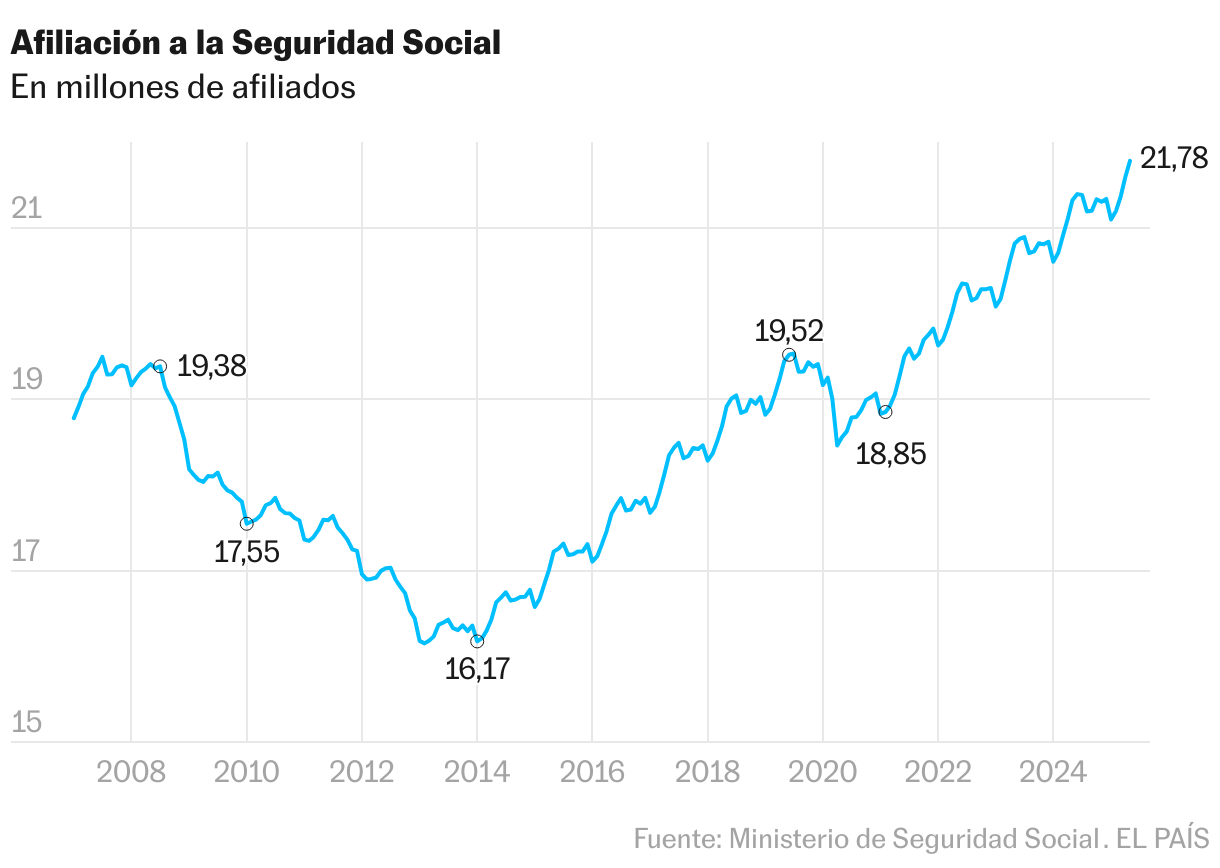 Esto no quiere decir que las cifras de empleo publicadas este martes por el Ministerio de Seguridad Social reflejen un frenazo en el mercado laboral ni mucho menos. De hecho, el empleo medido por este registro sigue creciendo interanualmente por encima del 2% (con 462.581 afiliados más que hace un año). Aunque este ritmo sí es ligeramente inferior al registrado en la mayoría de los meses de 2025, que venían anotando aumentos superiores al 2,3% interanual.
