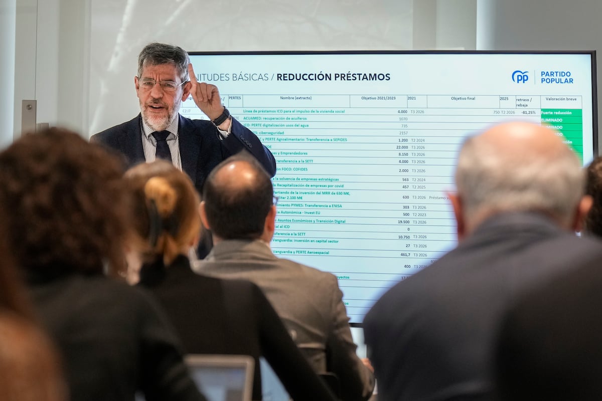 Nadal ha insistido en que los créditos se hubieran tenido que pedir hace dos o tres años, cuando el Banco Central Europeo empezó a subir los tipos de interés para luchar contra la inflación y las pymes estaban “asfixiadas”. “Se le pasó el arroz [al Gobierno]”, ha afirmado. El vicesecretario económico del PP ha presentado una recopilación de cómo se han rebajado o cancelado las cuantías de los préstamos europeos, uno por uno, inicialmente previstos, una operación llevada a cabo a través de la adenda al plan. “Al ministro le gusta hablar de agenda de la simplificación, pero es una rebaja de la ambición”, ha zanjado.