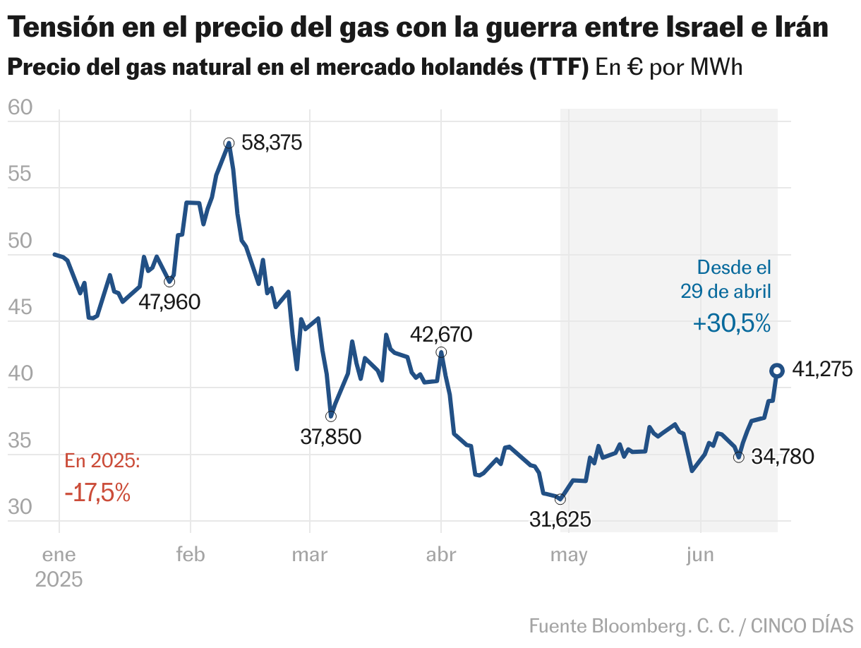 El ataque lanzado hace una semana por Israel sobre Irán se ha convertido ya en una guerra abierta entre ambos países que amenaza con extenderse por la región y en la que podría implicarse de forma inminente Estados Unidos en apoyo de Benjamin Netanyahu. La tensión en Oriente Medio ha terminado por estallar y su alcance es imprevisible, tanto para el conjunto de la comunidad internacional como para la economía. Si bien el petróleo es el gran protagonista y la materia prima que acapara titulares, el gas natural se ha disparado incluso a mayor ritmo. Desde que el martes pasado empezaran a circular informaciones sobre el riesgo de ataque, el precio del gas TTF negociado en Países Bajos, referencia en Europa, ha subido el 20%, hasta superar este jueves los 41 euros, con un alza en la sesión de más del 7%. En este mismo periodo el petróleo West Texas y el Brent han subido en torno al 17%.