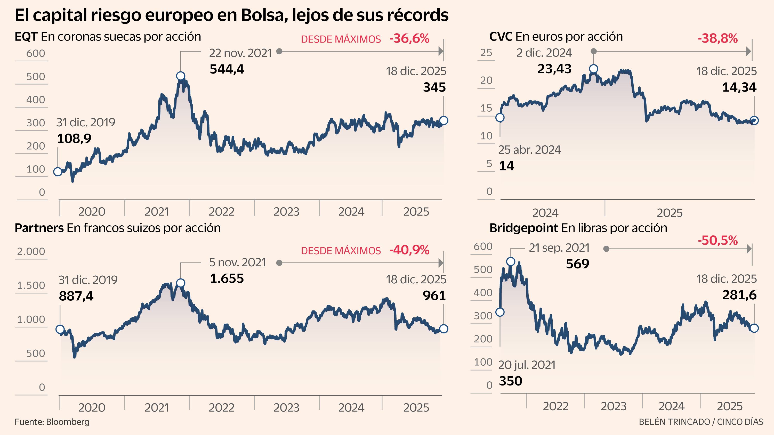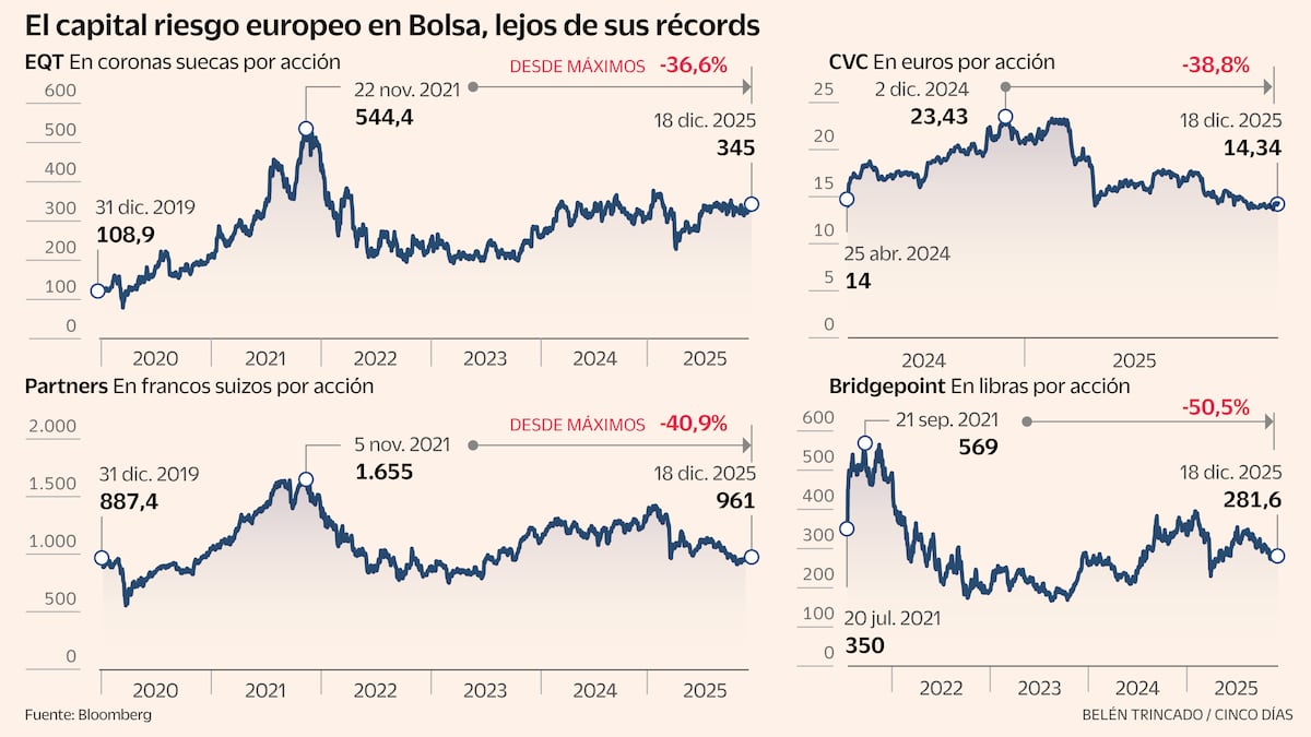 La francesa CVC, que debutó en Euronext en abril del año pasado, se sitúa en entorno de mínimos, tras ceder un 39% desde su récord. Con unos activos de unos 200.000 millones de euros, entre sus inversiones españolas destacan Deoleo, Naturgy y Exolum (la antigua CLH). La sueca EQT, que gestiona más de 240.000 millones y es conocida en España por ser propietaria de Parques Reunidos, de la Universidad Europea o de Zelestra (antigua Solarpack), cotiza un 37% por debajo de su máximo.