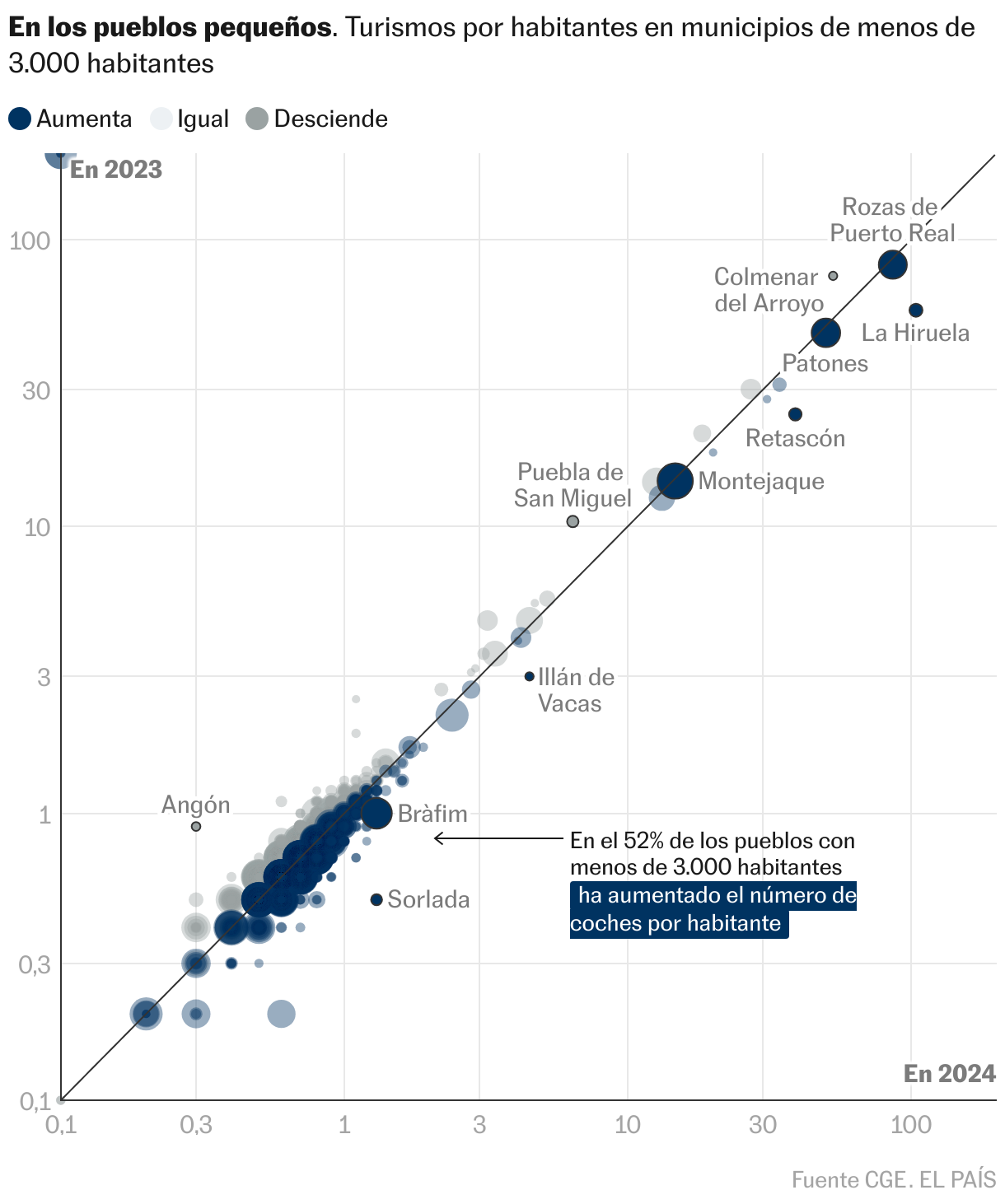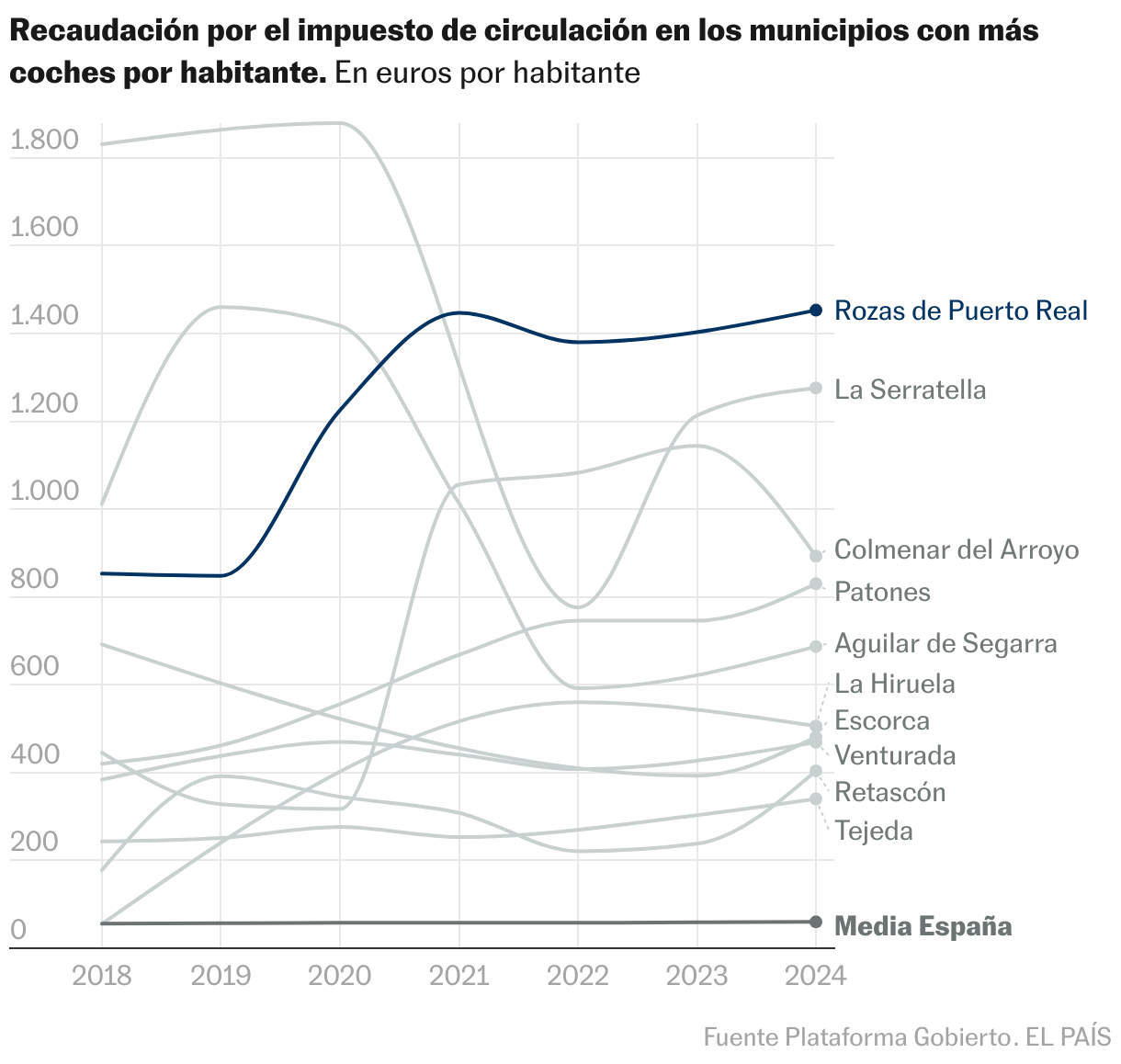 Como reconocía uno de los vecinos de Rozas de Puerto Real, estas prácticas reportan recursos fuera de lo común para este puñado de localidades. Según números del Ministerio de Hacienda, Rozas obtuvo en 2024 unos ingresos a través del impuesto de circulación de más de 842.000 euros. Para poder hacer paralelismos entre pueblos y comparar los efectos de manera exacta, la plataforma de datos Gobierto ofrece la recaudación por habitante. En el caso de Rozas, el impuesto de circulación reporta casi 1.450 euros por persona al año, una diferencia abismal con los 76 euros anotados en la provincia de Madrid y los 60 euros de media en España. En La Serratella (otro pequeño pueblo de Castellón) se ingresan 1.276 euros por vecino, en Colmenar del Arroyo y Patones se rozan los 800 euros y en La Hiruela, los 500 euros.