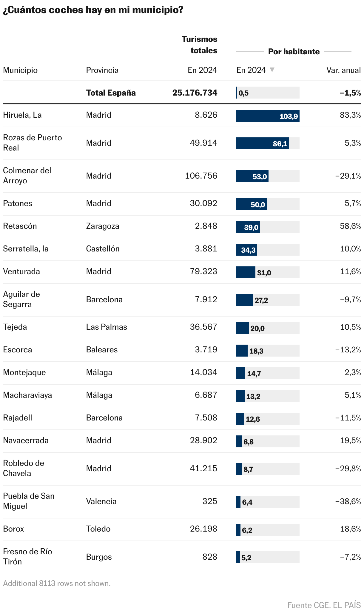 Hay más municipios que recurren a estas maniobras y se benefician del vacío legal. Según las fichas socioeconómicas del Consejo General de Economistas correspondientes a 2024, el récord de vehículos por habitante lo ostenta La Hiruela (Madrid), con 104 coches por cada uno de sus 83 vecinos. Tras Rozas, figuran Colmenar del Arroyo y Patones, también en la Comunidad de Madrid, con alrededor de 50 automóviles por persona y poblaciones de 2.000 y 600 habitantes, respectivamente. En todos estos casos, la proporción supera ampliamente la media de España, que se sitúa en 0,5 vehículos por habitante.