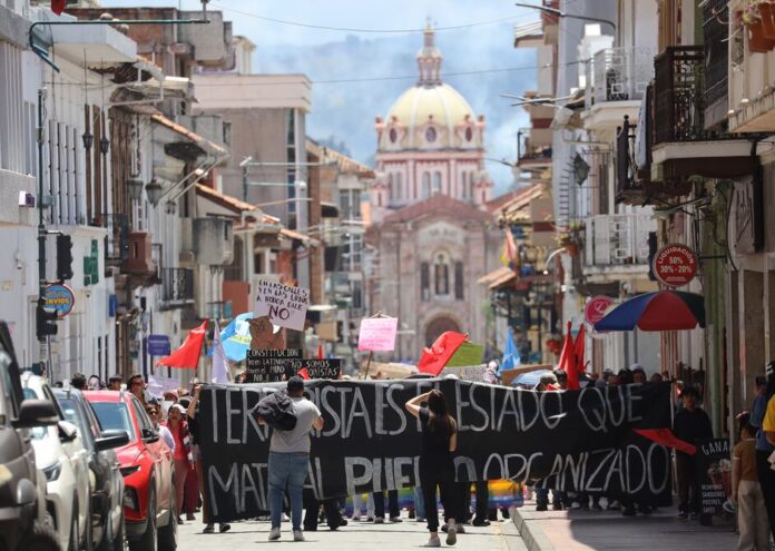 “No somos terroristas. Somos resistencia”, “No a la consulta mañosa”, “Derecho a la resistencia” fueron las frases que se leían en carteles portados este domingo por manifestantes que recorrieron las calles de Cuenca.