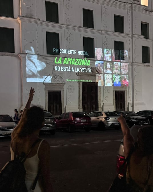 La noche del jueves 20 de noviembre se proyectó en cuatro edificios emblemáticos de la ciudad brasileña de Belém, sede de la COP30, el mensaje “Noboa, la Amazonía no está en venta”, una acción impulsada por organizaciones ambientales e indígenas para alertar sobre los riesgos que atribuyen a la actual agenda petrolera del Gobierno del presidente Daniel Noboa.