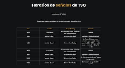 ¿Por qué sus señales son siempre a las mismas horas? Un exinversor de TSQ Investment explica que la cotización se manipula justo en el momento de la señal y que, aunque a veces los precios de Hellobit con otras plataformas como Binance, esto no era de extrañar porque solo había dos opciones posibles. “Esa página web es suya y muestran a los afiliados lo que quieren ver, ni más ni menos”, explica. “Yo estuve poco tiempo, entré sabiendo dónde me metía, que era una estafa piramidal, pero como tenía varios amigos dentro, pensé que me podía dar tiempo a entrar, recoger beneficios y salir. Así fue”, remacha. Dejó TSQ cuando se intensificó la presión para que atrajera a gente, algo a lo que se negó.